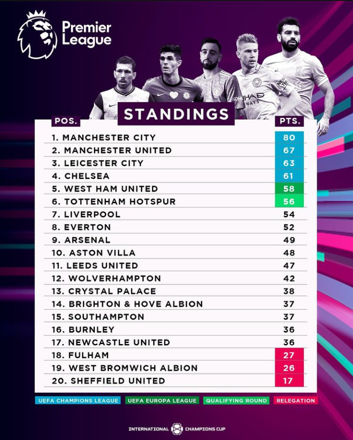 Select a team all teams arsenal aston villa brighton burnley chelsea crystal palace everton fulham leeds united leicester city liverpool manchester city manchester united newcastle united sheffield united southampton tottenham hotspur west. The current and complete premier league table & standings for the 2020/2021 season, updated instantly after every game. The premier league has promotion and relegation linked to the english championship, the second tier. Find fixtures epl, results, today's and tomorrow's matches premiership. Epl 2020/21 table 03/may/2021 match week 34.